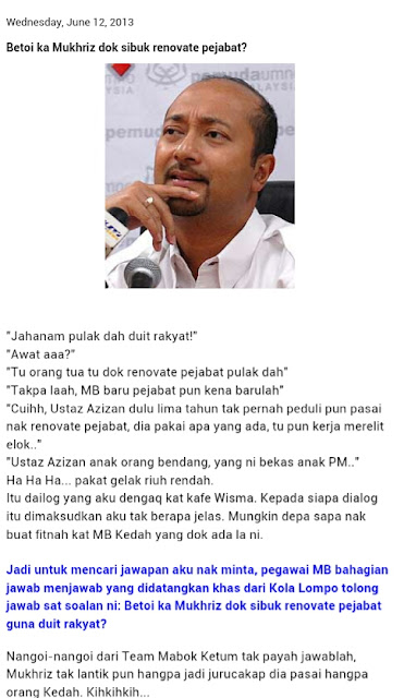 BLOGER PAS KEDAH MENUDUH MB MUKRIZ MENGUBAH SUAI PEJABAT MB KEDAH DENGAN DUIT RAKYAT. TETAPI HAKIKATNYA INI CUMA FITNAH YANG DILEMPARKAN OLEH BLOGER PAS YANG CEKAP MEMFITNAH. KEADAAN DI PEJABAT MB MASIH KEKAL SEPERTI MANA YANG DIGUNAKAN OLEH USTAZ AZIZAN DULU. KALI TERAKHIR PUN YANG BUAT UBAH SUAI IALAH USTAZ AZIZAN MASA JADI MB KEDAH. KALAU DIA NAK UBAH SUAI PUN ITU HAK DIA SEBAGAI MB KEDAH. TETAPI MB MUKRIZ TIDAK MEMBUAT SEBARANG PENGUBAHSUAIAN SEPERTI YANG DITOHMAH OLEH PUAK PAS SEPERTI GAMBAR DI ATAS. DI HARAP RAKYAT KEDAH TIDAK TERUS DIPERALAT OLEH PEMBANGKANG TERUTAMA DI KEDAH. CUKUP 5 TAHUN KITA TERSEKSA DAN MERANA. 1KEDAH SOKONG MB MUKRIZ