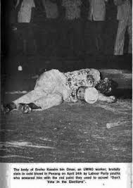 PADA MALAM 24 APRIL SEKITAR 8.30 MALAM MERUPAKAN HARI TERAKHIR BAGI PERJALANAN HIDUP ENCIK KASSIM BIN OMAR. ARWAH YANG MERUPAKAN PEKERJA PILIHAN RAYA UMNO DALAM PERJALANAN PULANG KE RUMAH. KETIKA SAMPAI DI SUATU KAWASAN DI JELUTONG, PULAU PINANG, DIA TERLIHAT SUATU KEADAAN ORANG RAMAI YANG BERKUMPUL. SEMASA BERTANYA PERIHAL KEJADIAN ITULAH BELIAU TELAH DISERANG DAN DIBUNUH DENGAN KEJAM OLEH BEBERAPA ORANG PEMUDA. LEBIH DASYAT LAGI MUKANYA DILUMURKAN DENGAN CAT MERAH. ADA YANG MEMBERITAHU MAYAT BELIAU BUKAN HANYA DILUMURKAN CAT MERAH DI MUKA SAHAJA, MALAH DI SELURUH BADAN. TUNKU MENYEBUT PEMBUNUH ITU MERUPAKAN AHLI PARTI BURUH. PERKARA YANG KPS INGIN KITA RENUNGI PADA SAAT PENULISAN INI IALAH BERKENAAN CAT MERAH. CAT MERAH INI DIGUNAKAN OLEH SAMSENG POLITIK KETIKA KEMPEN BERLANGSUNG UNTUK MENGECAT PERKATAAN “JANGAN MENGUNDI DALAM PILIHAN RAYA”. CAT MERAH JUGA MERUPAKAN WARNA PARTI KOMUNIS. PIHAK BERKUASA MENYERU PEMIMPIN MELAYU DAN AHLI KELUARGA MANGSA SUPAYA TIDAK MENGHEBAHKAN BERITA KEMATIAN INI. PARA PEMIMPIN MELAYU DAN KELUARGA MANGSA DENGAN JIWA YANG BESAR TELAH BERSETUJU DENGAN CADANGAN INI DAN DAPAT MENGHINDARI MALAPETAKA RUSUHAN KAUM DENGAN LEBIH AWAL SEDIKIT. NAMUN ITU BUKAN JAMINAN, PANAS YANG DIHARAP SEPANJANG HARI, AKHIRNYA HUJAN JUGA DITENGAH HARI. 10 HARI SELEPAS KEJADIAN TERSEBUT, IAITU PADA 4 MEI SUATU KEJADIAN BESAR TELAH BERLAKU DI SELANGOR. PENTING DICATAT, MULAI DETIK INILAH KITA DAPAT MENILAI SIAPAKAH YANG SEBENARNYA DALANG SERTA SYAITAN DALAM TRAGEDI HITAM 13 MEI. KPS TIDAK INGIN MENUDUH SESIAPA DAN PIHAK MANA TETAPI PEMBACA SEKALIAN SILA TENTUKAN.